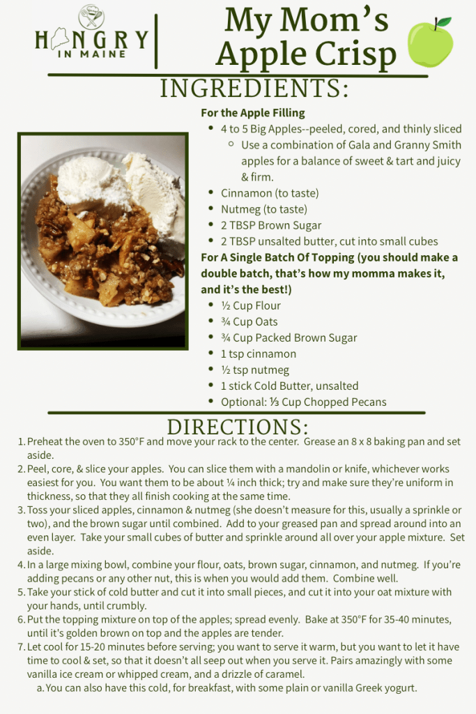 With fall season comes the much heated debate, apple cider or pumpkin spice? And I, for one, am an apple/cider girly. So, let me introduce you to the only apple recipe you’ll need this fall, my mom, Melissa’s, apple crisp recipe. Now, this is not just any apple crisp recipe; this is THE apple crisp recipe.