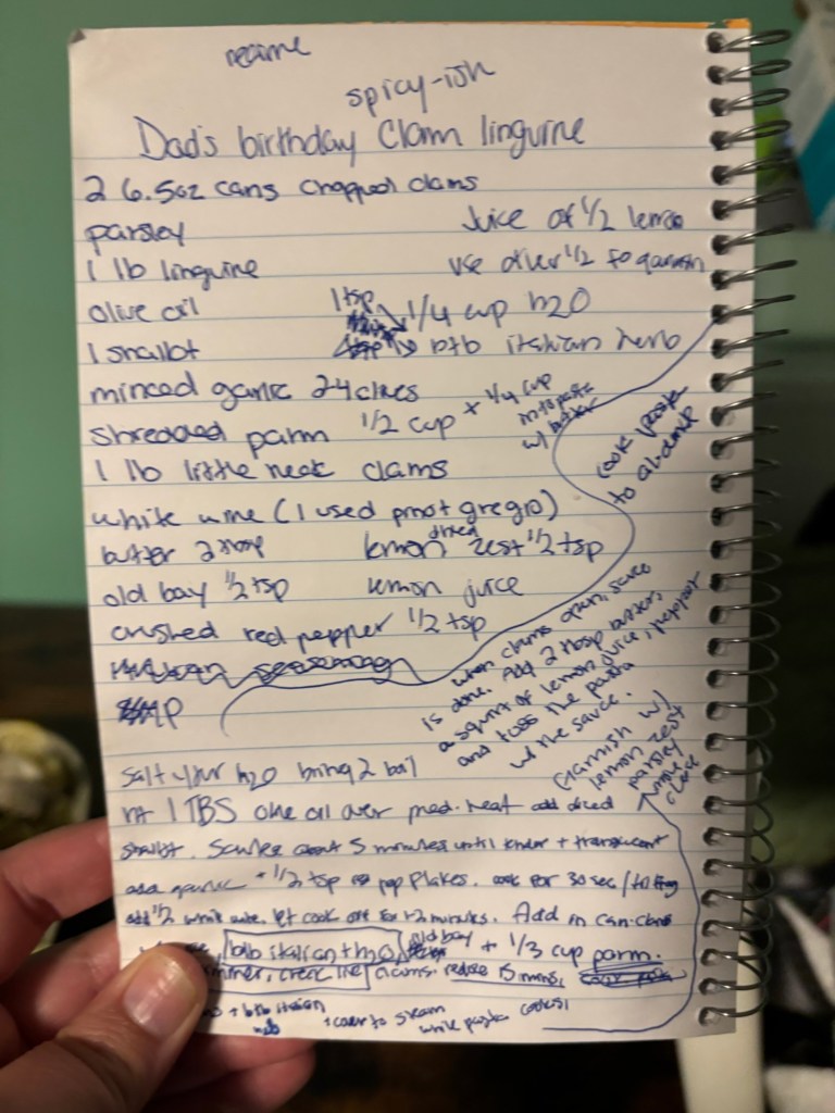 When I sit down to write a recipe for this blog, it usually starts with me scribbling in a notebook like a mad scientist. See the picture below? Yeah..that’s an actual page of my recipe notebook. Ingredients, witty name, scribbles, arrows, measurements, random “WTF” question marks…. It is not pretty, and barely legible, but it’s real. These are my notes for the clam linguine that I made my dad for his birthday recently; he always calls it “restaurant quality”. I’ve made it dozens of times, and never actually used a recipe, so it was different every single time I made it. It’s all stuff I usually have on hand, minus the clams, so besides the measurements, it’s pretty close to how I’ve always made it. Instead of eyeballing it, I measure it this time, so I can share my dad’s special birthday dinner with you all (post coming in the very near future).